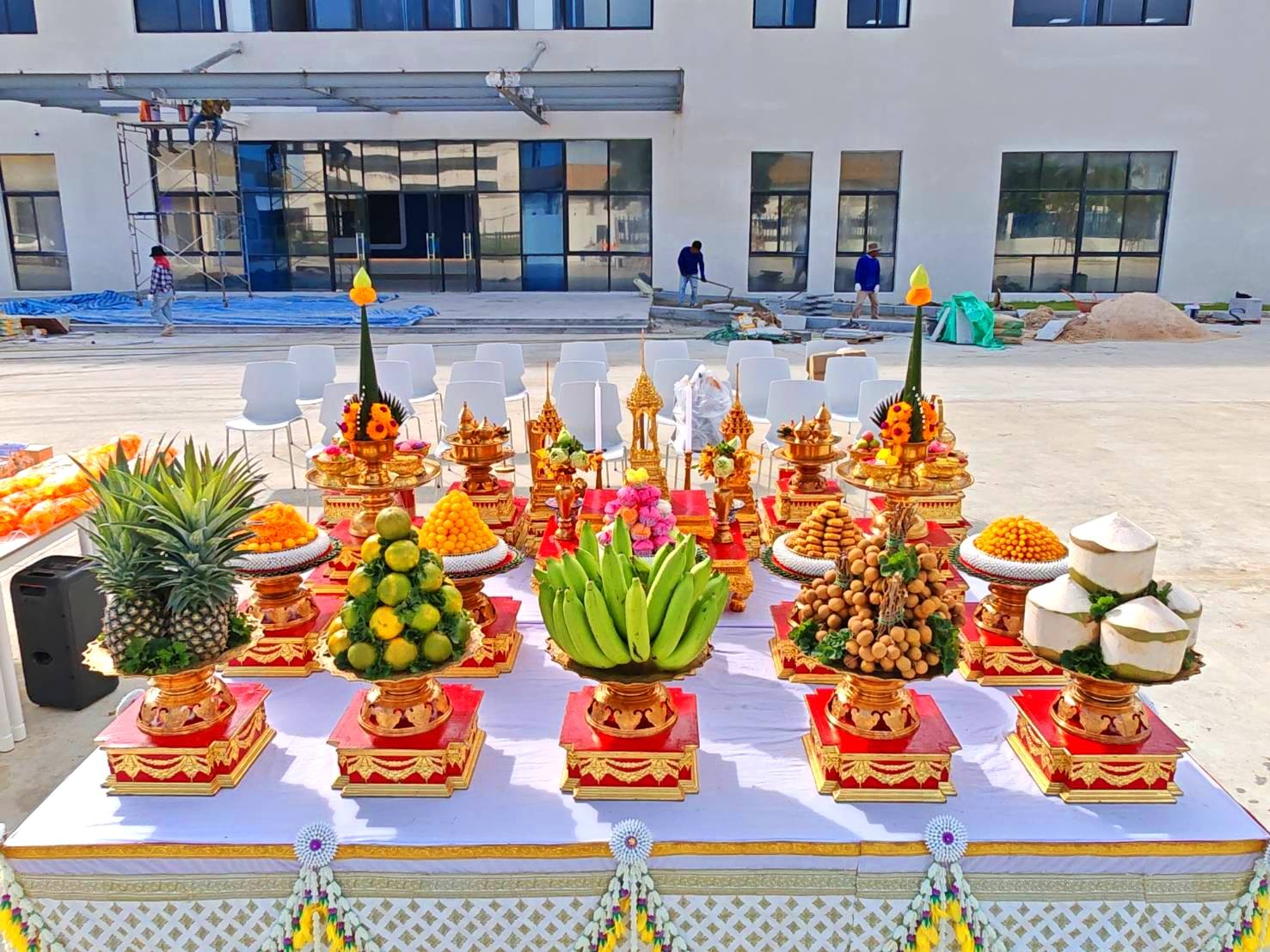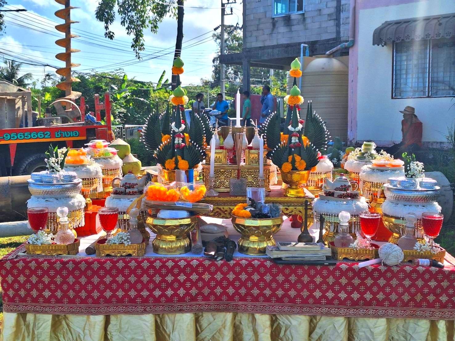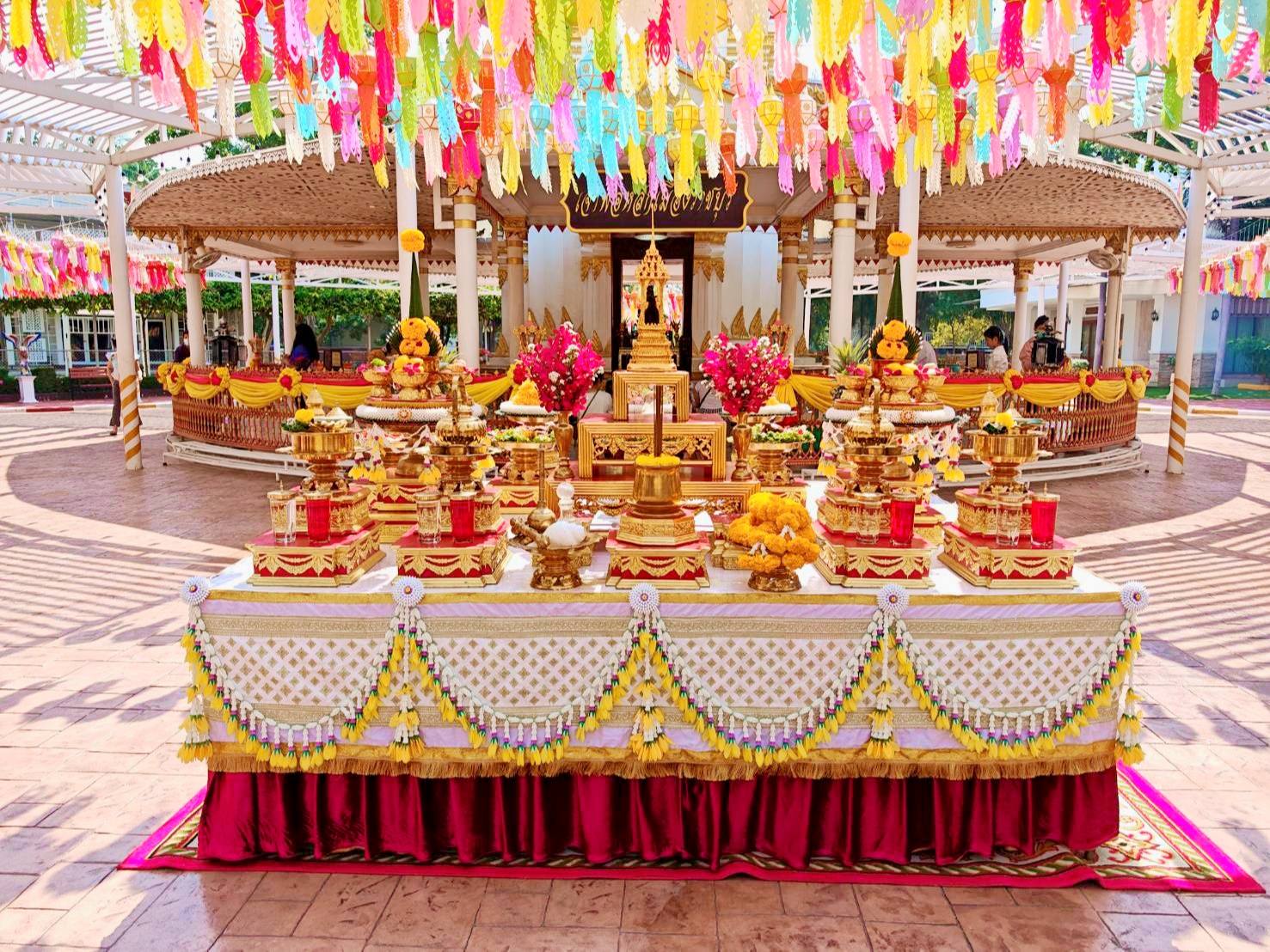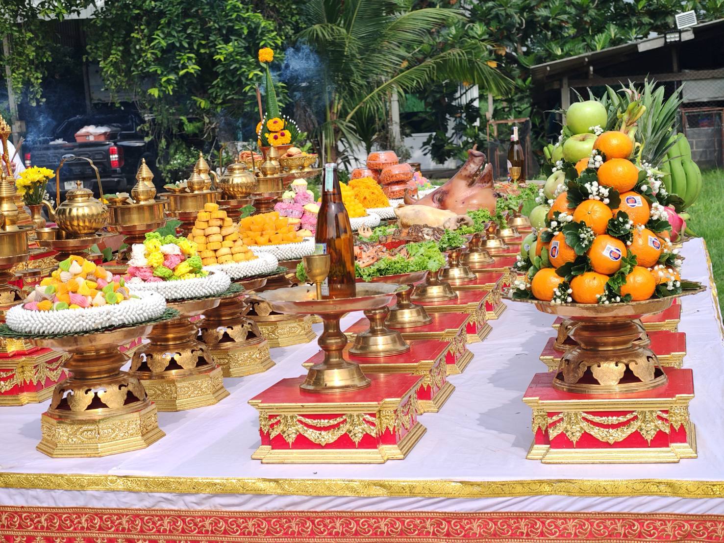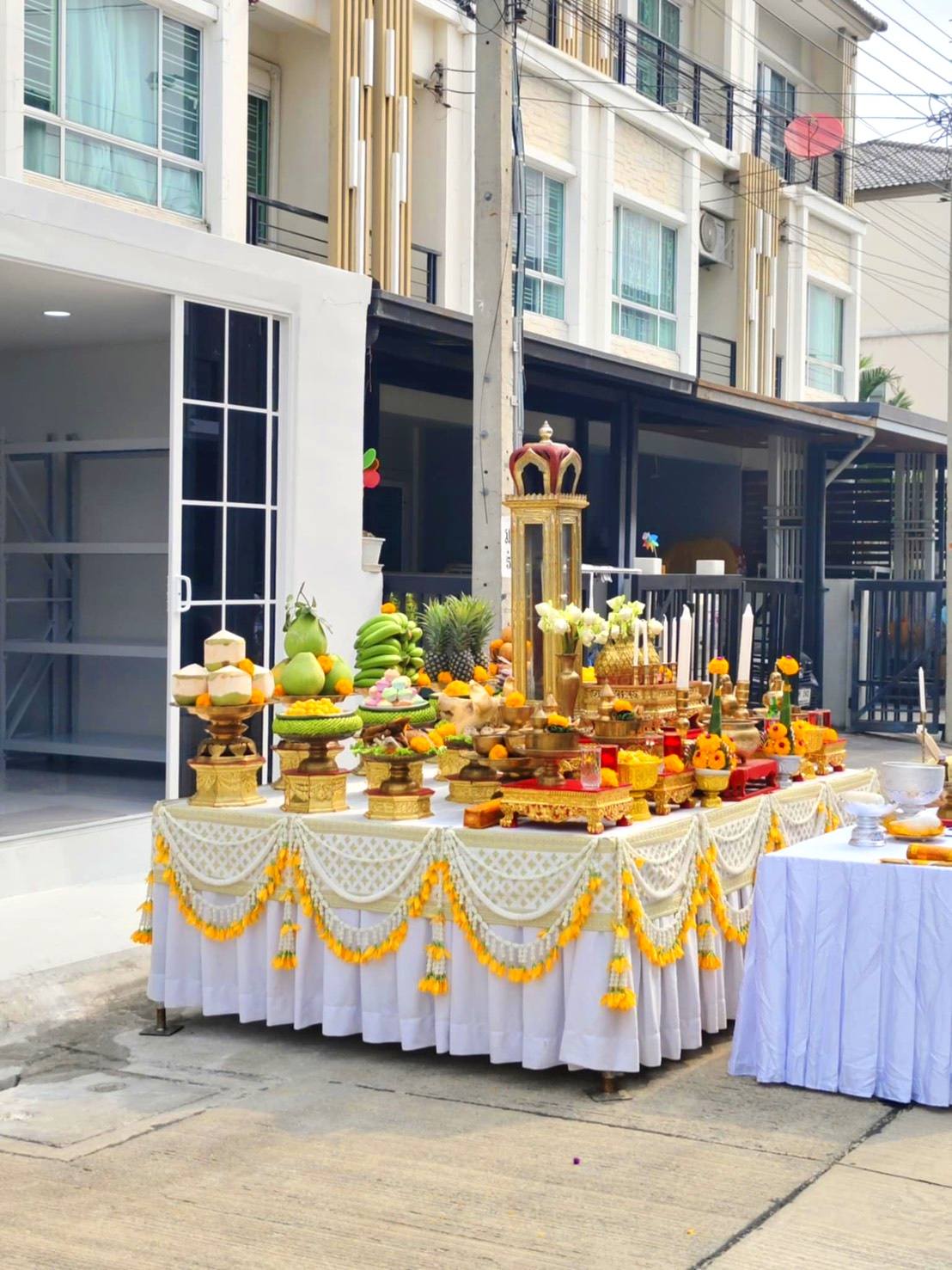 • ตั้งโต๊ะพิธี ดอกไม้–ผลไม้ อาหารคาวหวาน